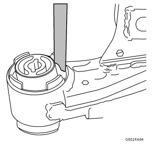 2. NOTE: The bushing can be damaged if it is pressed to deep. The bushing should be pressed so that the flange on the bushing is resting on the rear suspension support.