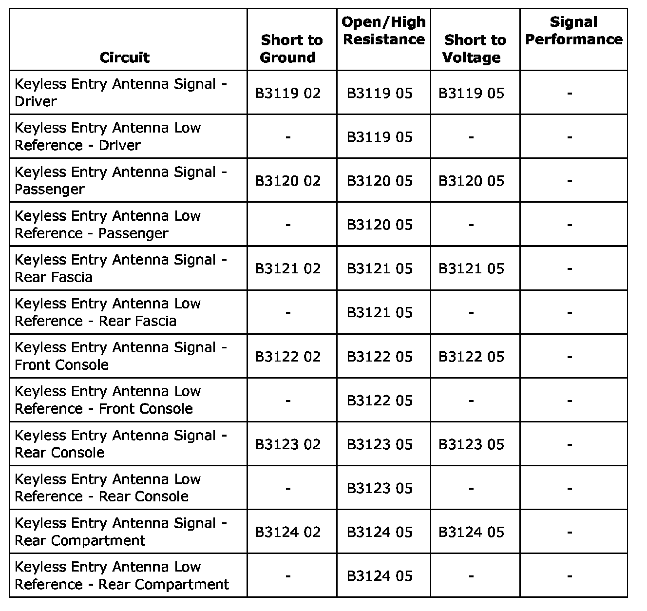 7. If all circuits test normal, test or replace the keyless entry antenna.