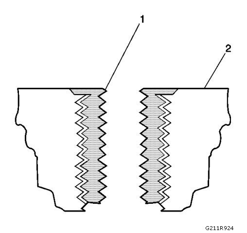 14. Inspect the insert (1) for proper installation (2) into the tapped hole.
