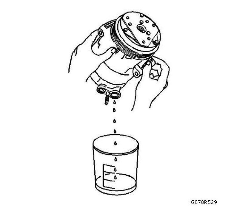 1. NOTE: Drain and measure as much of the refrigerant oil as possible from the removed compressor.