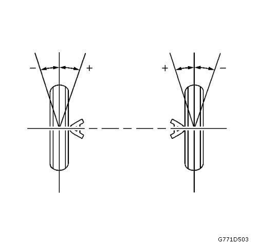 Toe DescriptionToe is a measurement of how much the front and/or rear wheels are turned in or out from a straight-ahead position. When the wheels are turned in, toe is positive (+). When the wheels are turned out, toe is negative (-). The actual amount of toe is normally only a fraction of a degree. The purpose of toe is to ensure that the wheels roll parallel.