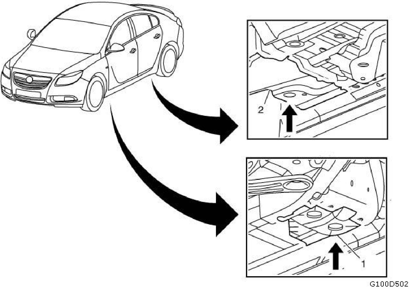 NOTE: To prevent damage to components and aggregates when raising vehicles, apply lifting tools at the points shown. The manufacturer's guidelines for handling lifting tools must be observed. When jacking up a vehicle with the on-board tool, follow the instructions in the Owner's Manual.
