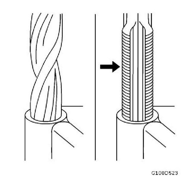 - Refer to the thread repair kit manufacturer's instructions regarding the size of the drill and tap to use.