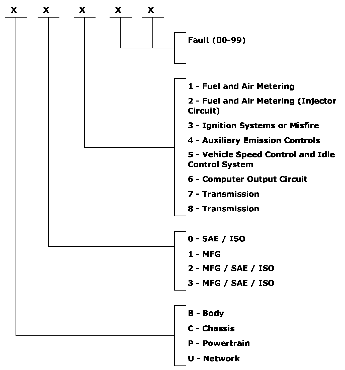 - ISO/SAE has specified what diagnostic trouble codes should look like, which is a legal requirement in the USA. ISO/SAE determines all codes which have 0 in the second position.