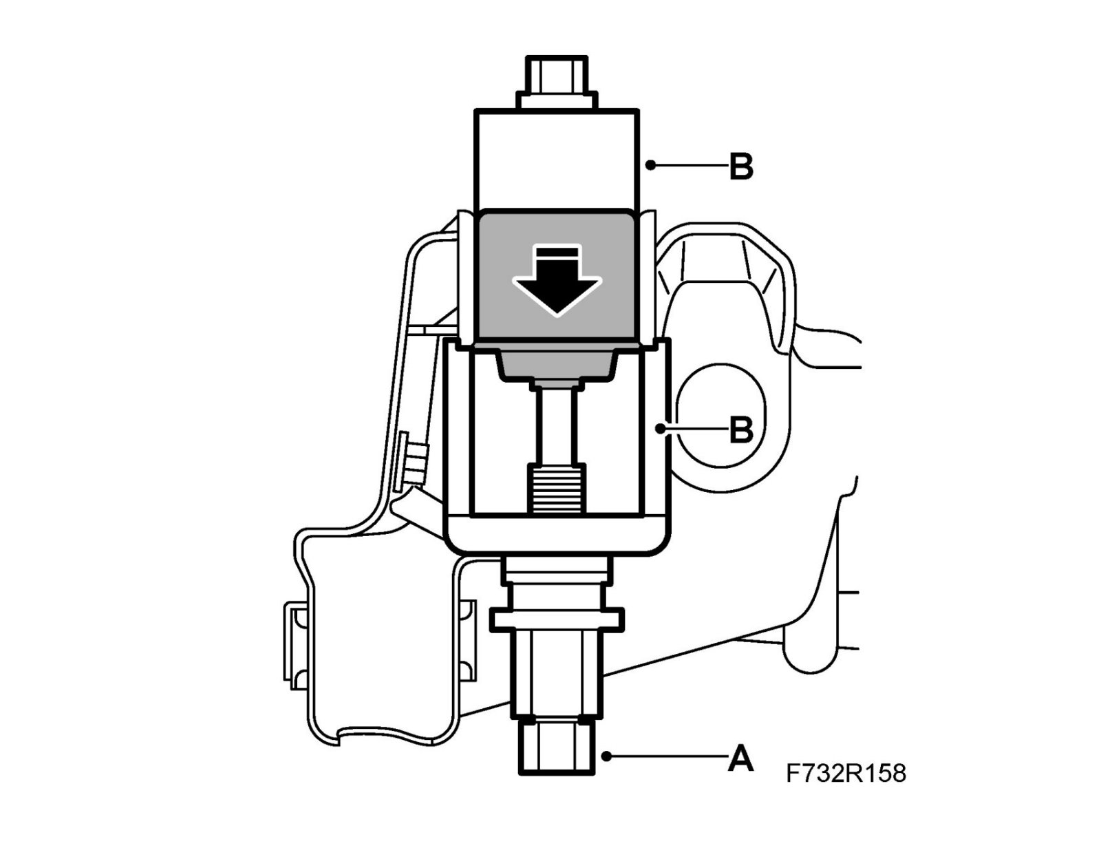2. Press out the bush using the pull rod (A) from 89 96 779 Set of press sleeves, front assembly (or a hydraulic press) and 89 96 928 Removal tool, rear subframe bushes (B).
