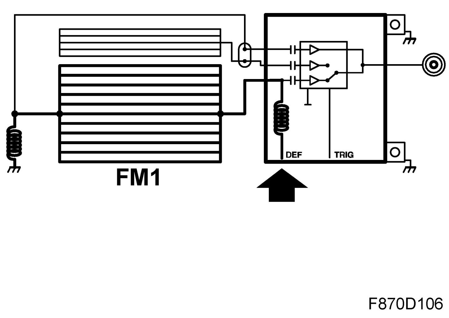 The heating coil receives voltage B+ from REC pin 2 (electrically-heated rear window relay) through the antenna amplifier and is connected to ground through an antenna filter which blocks the antenna ground signal.