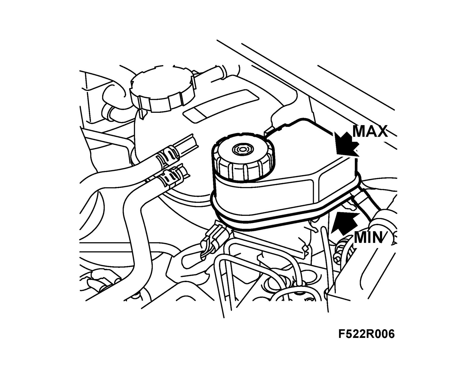 2. Check the fluid level using the MIN and MAX markings on the reservoir.