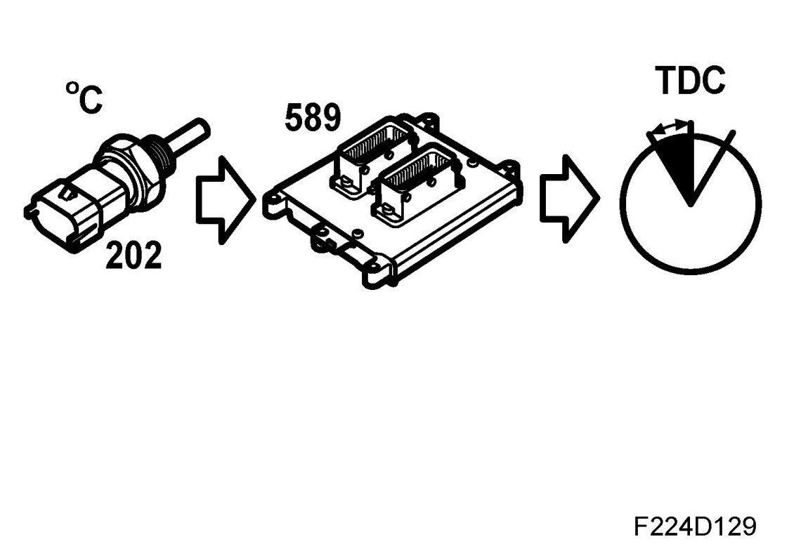 Starting ignition timing will be active from when the engine is stationary until the engine speed reaches 500 rpm. The starting ignition timing depends on the engine speed and coolant temperature. Normal starting ignition timing when the coolant temperature is 20 degrees C is 6 degrees BTDC.