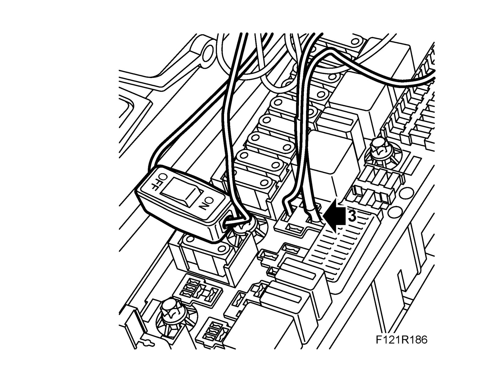 3. Connect 83 93 886 Diagnostics cable, LH system to relay holder sleeves 87 and 30. Make sure that the switch is in the OFF position.