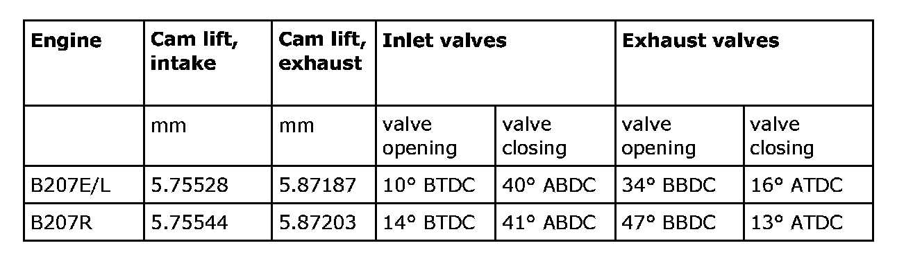 B207E/L: Total valve opening duration intake and exhaust: 230°