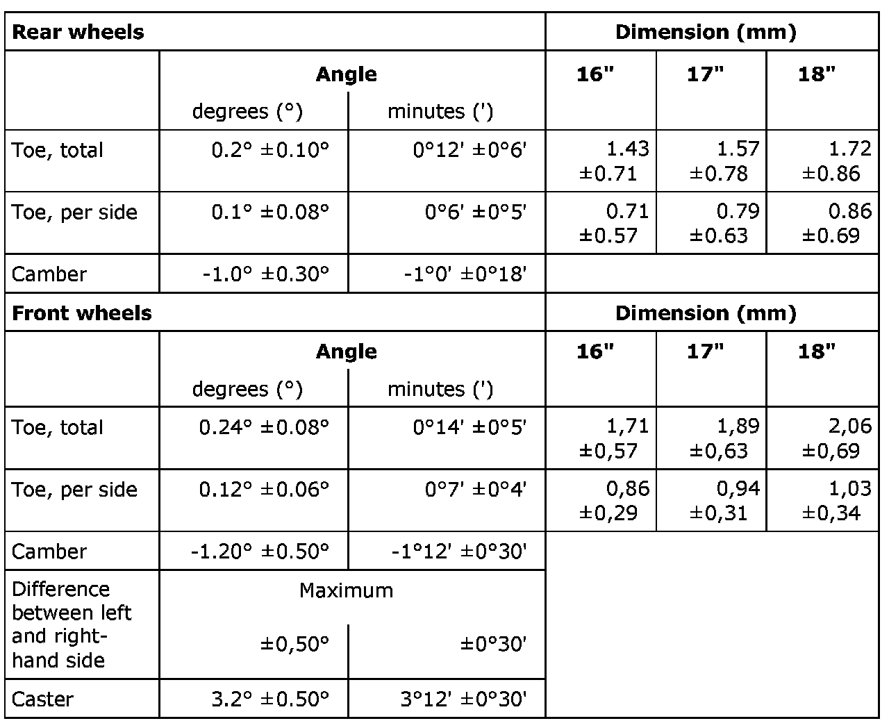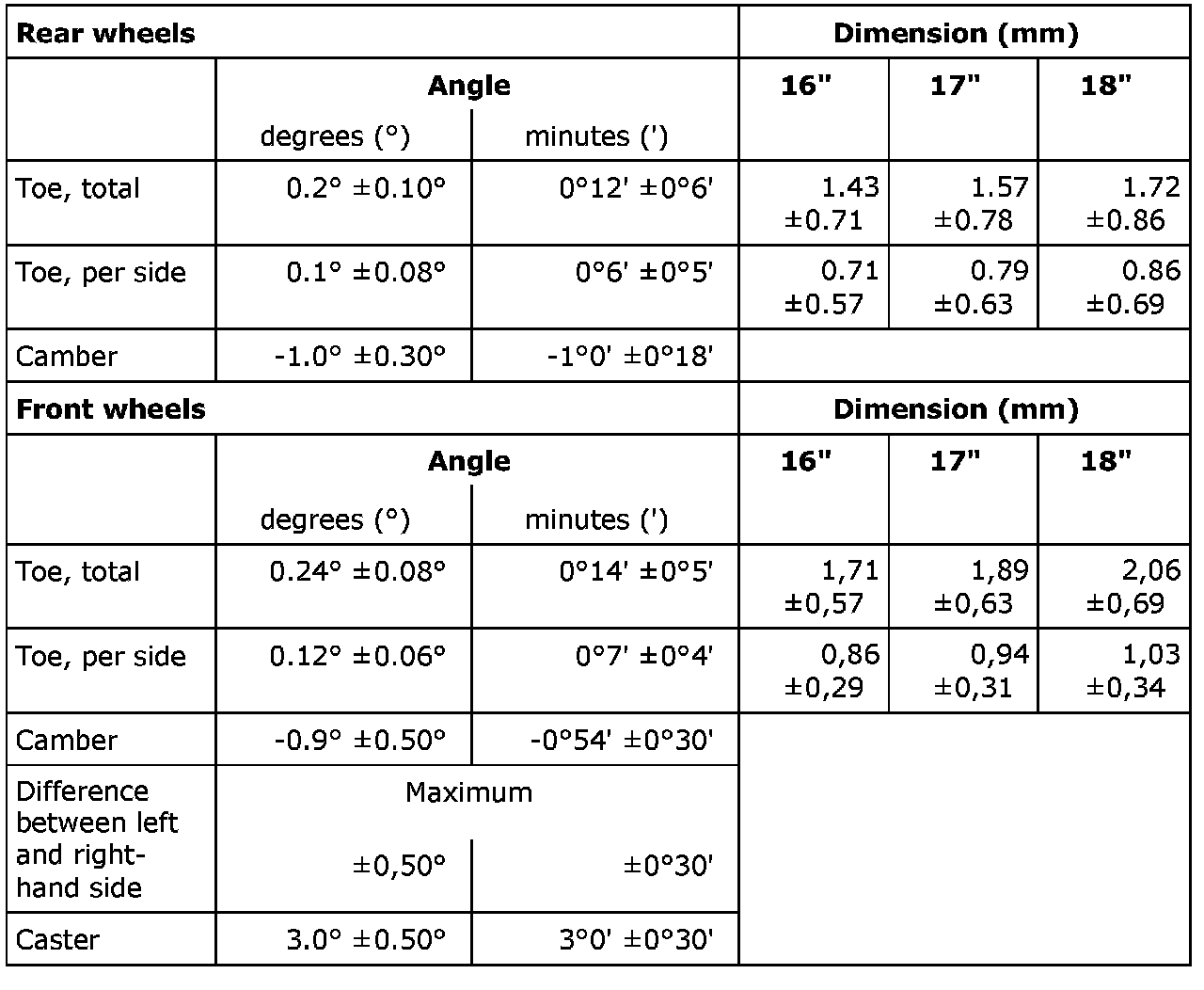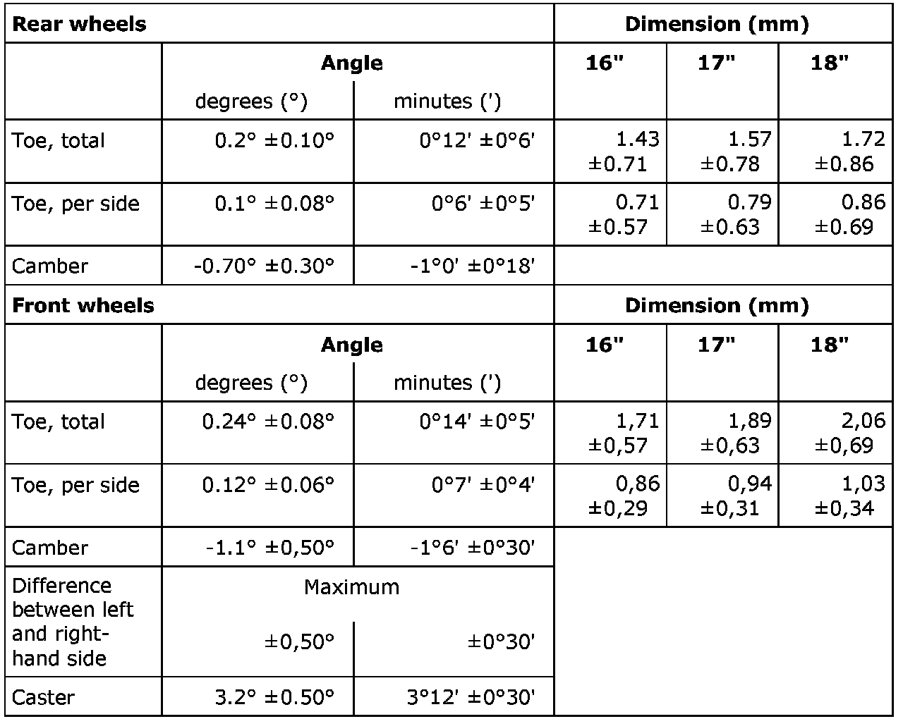 Wheel geometryStandard chassis