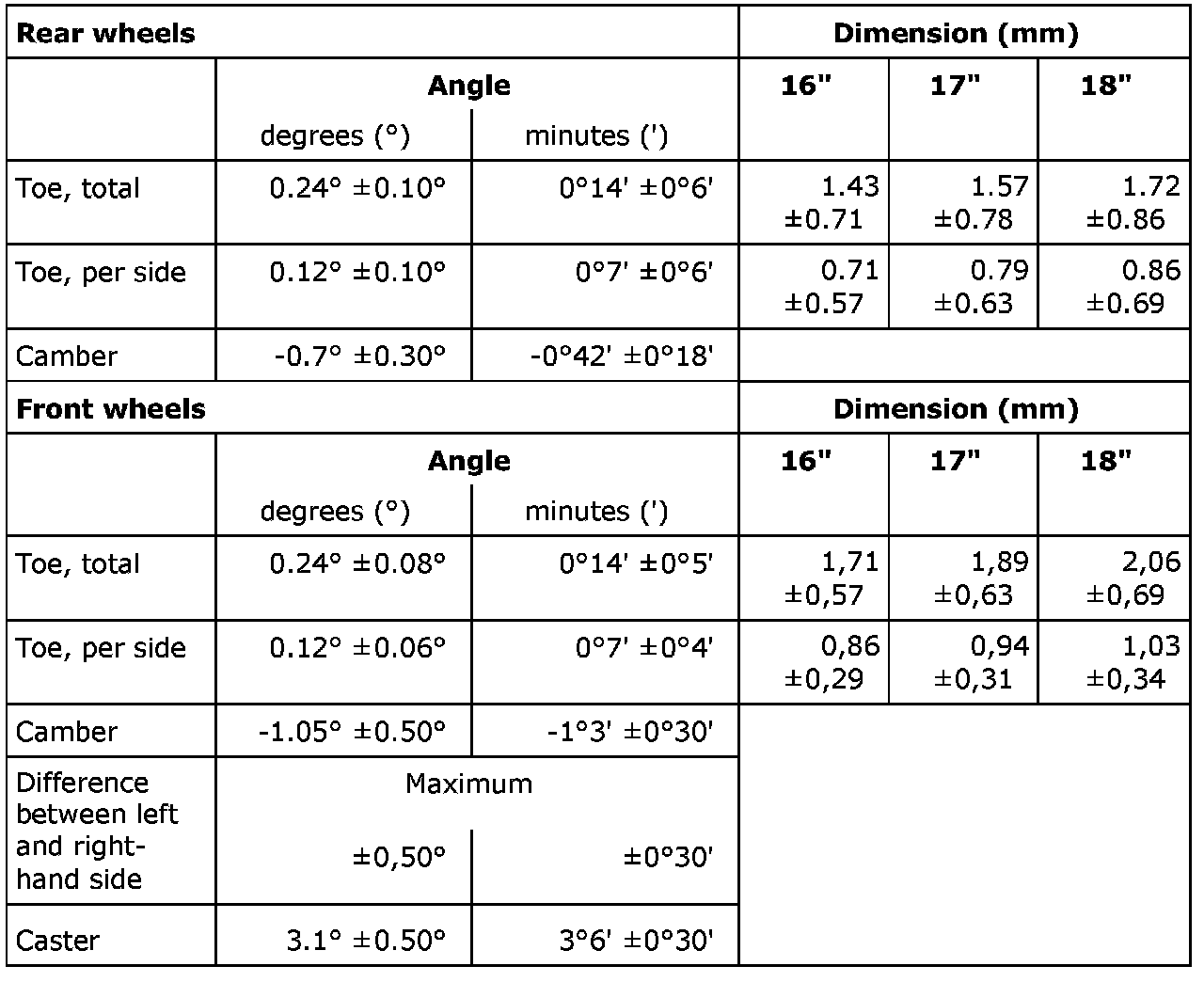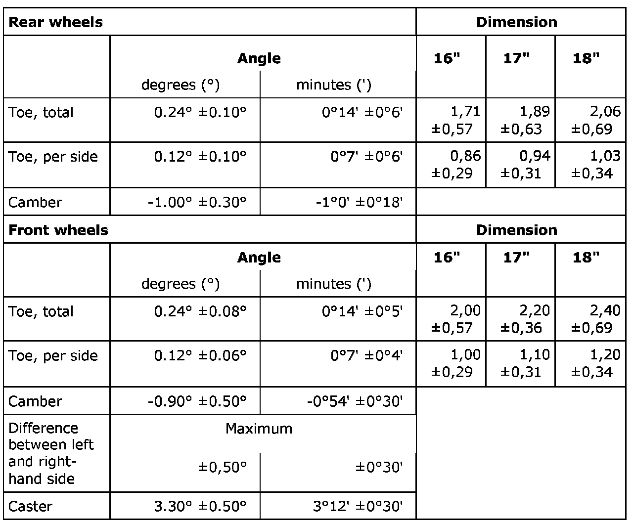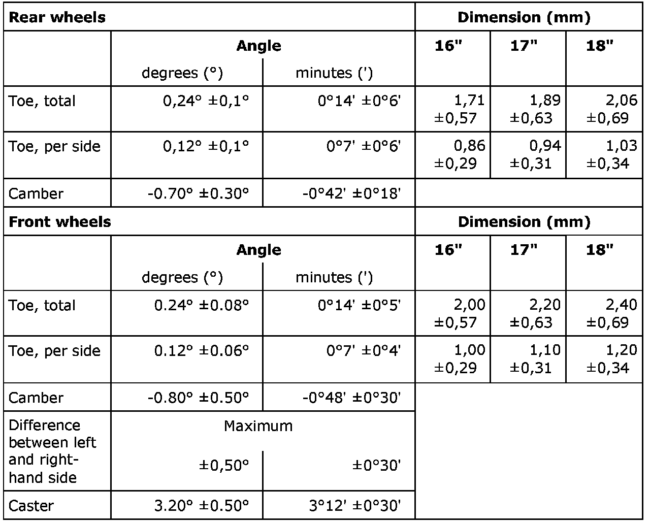 Wheel geometryStandard chassis