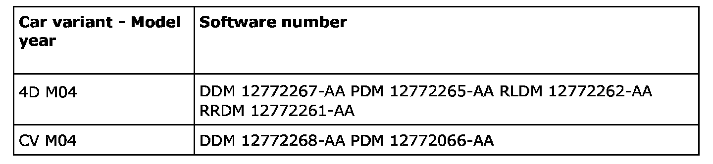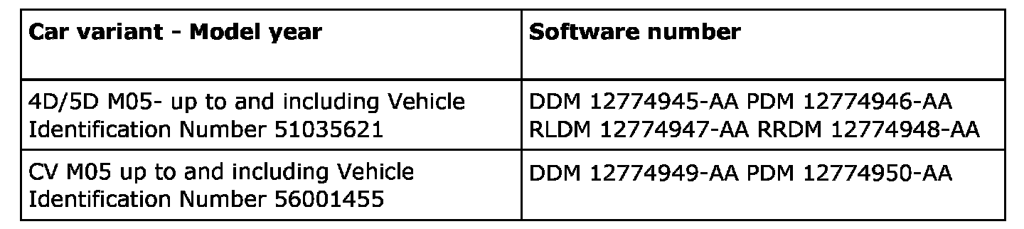 Connect Tech 2 (version 126.000 or later) and perform the update. The software is available on IRIS from and including TIS2000 edition 2006-3 update 1. Add the door control module with Tech 2 under the menu, All - Add/Remove. Check the function.