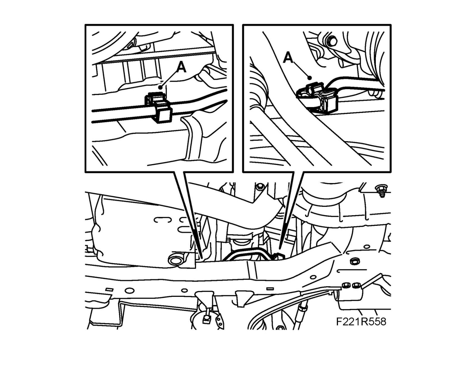 7. Attach the power steering pipe to the plastic clips on the subframe (A).