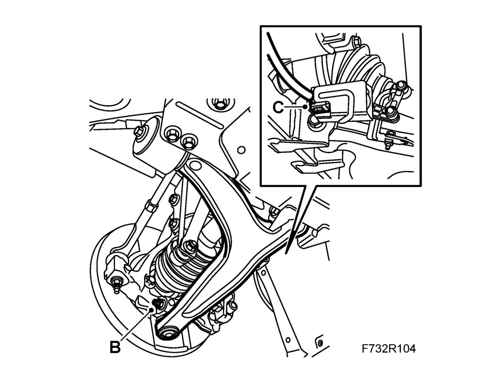 11. Cars with Xenon lights: Remove the level sensor (C) on the left-hand suspension arm, and the wiring harness' clip.