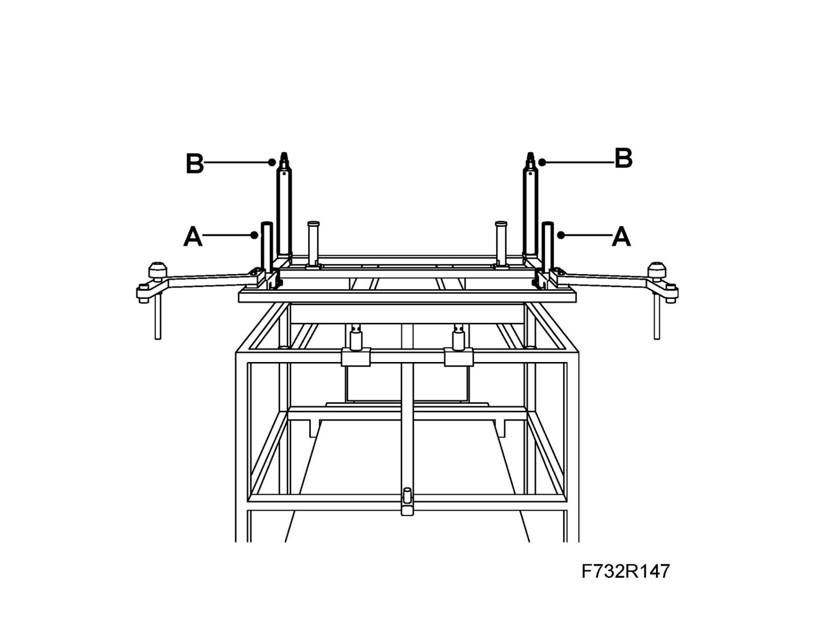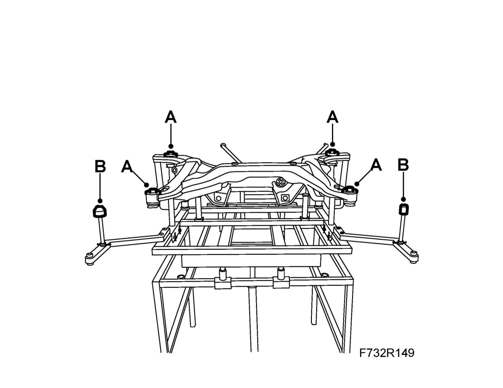 4. Place washers (A) on the subframe bushes. Raise the subframe. The jig's locating pins (B) must fit in the holes in the body.