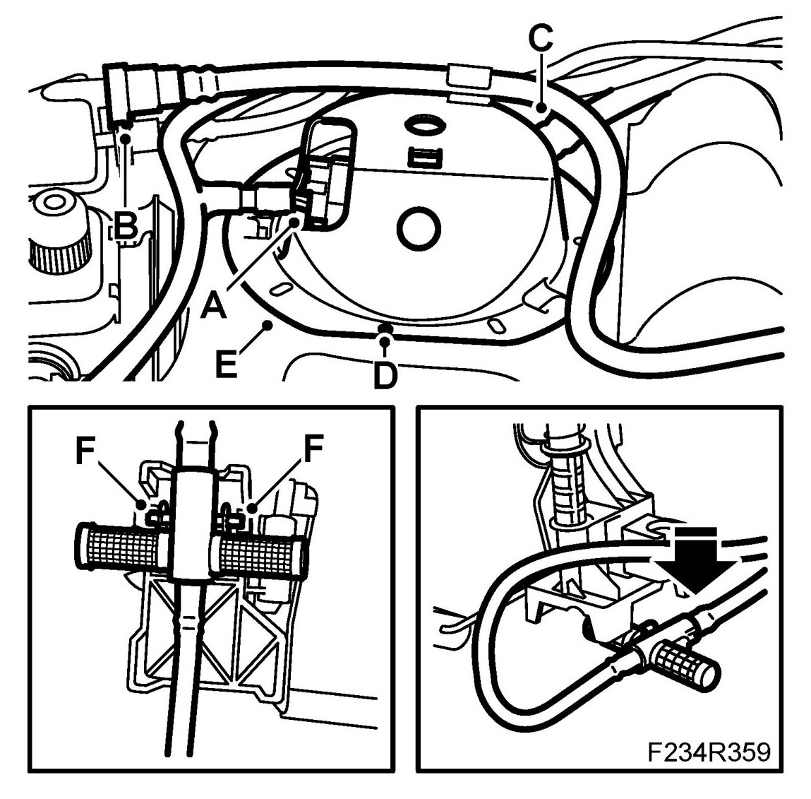 2. Insert the fuel level sensor in the tank and snap on the sensor's bracket (F) in the right position.