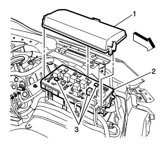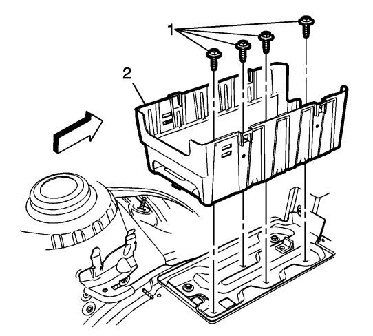 8. Remove the front compartment fuse block (2). Refer to Front Compartment Fuse Block Replacement.