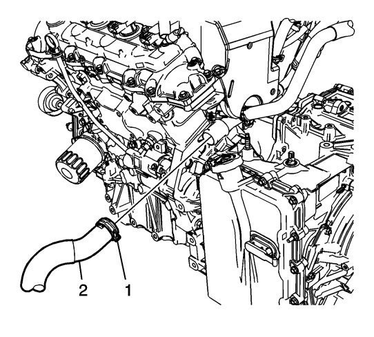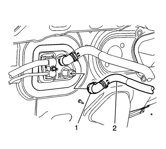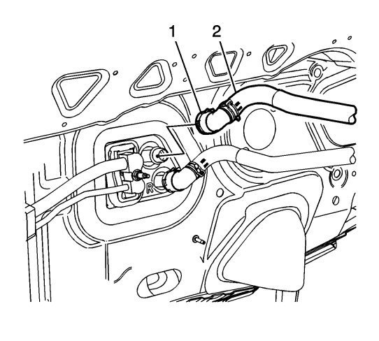 15. Release the clip from the quick disconnect (1) and remove the heater outlet hose (2) from the heater core tube.