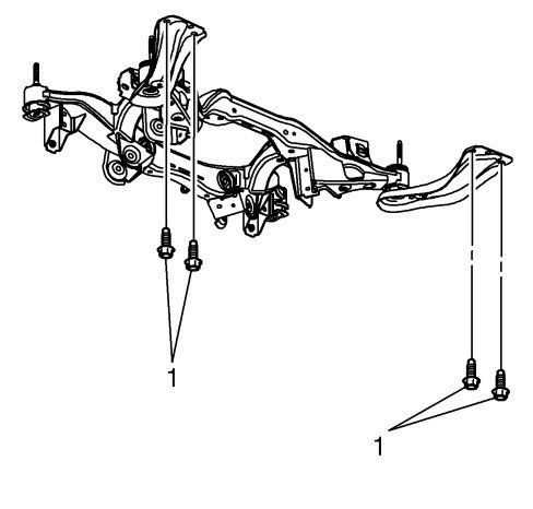 8. Install NEW reinforcement arm bolts (1) to body and tighten to 58 Nm (43 lb ft). Install the front and rear frame bolts. Refer to Drivetrain and Front Suspension Frame Replacement.