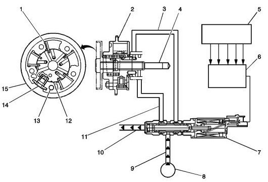 The ECM operates the CMP actuator solenoid valve by pulse width modulation (PWM) of the solenoid coil. The higher the PWM duty cycle, the larger the change in camshaft timing. The CMP actuator assembly also contains a lock pin (14) that prevents movement between the outer housing and the rotor vane assembly. The lock pin is released by oil pressure before any movement in the CMP actuator assembly takes place. The ECM is continuously comparing CMP sensor inputs with CKP sensor input in order to monitor camshaft position and detect any system malfunctions. If a condition exists in either the intake or exhaust camshaft actuator system, the opposite bank, intake or exhaust, camshaft actuator will default to 0 crankshaft degrees.