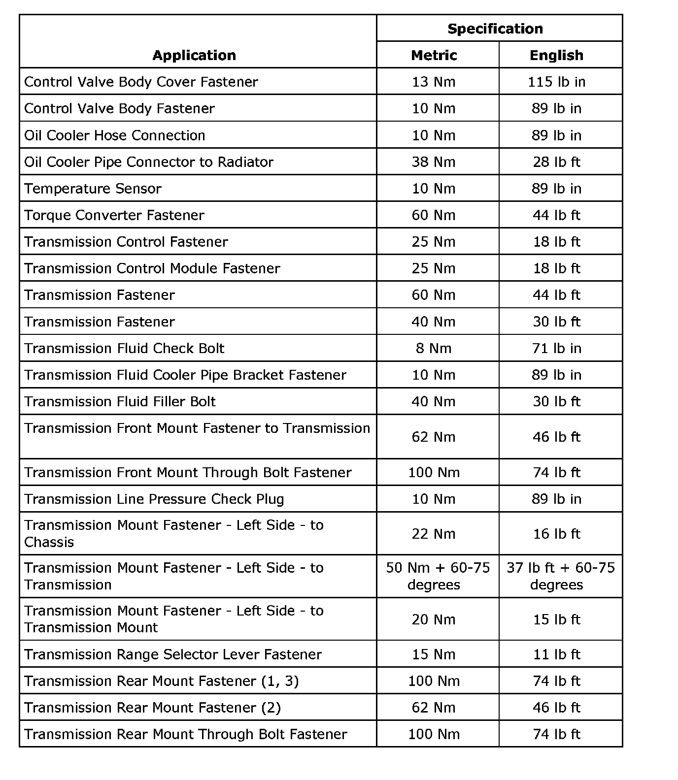 Fastener Tightening Specifications