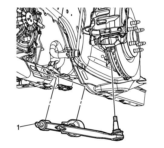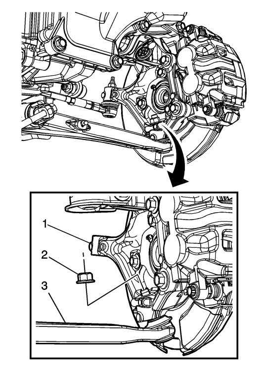 5. Loosen the front lower control arm ball stud nut (2) from the ball joint.