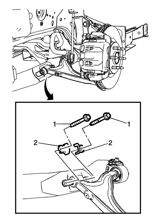 Remove front lower control arm front bolts (1) and the brackets (2).