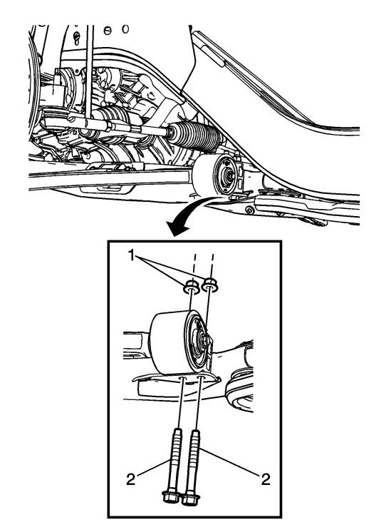 8. Remove the front lower control arm rear nuts (1) and the front lower control arm rear bolts (2).