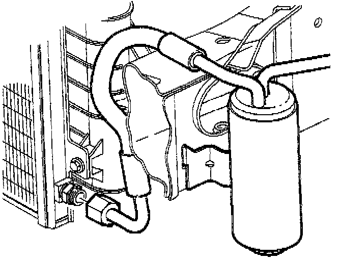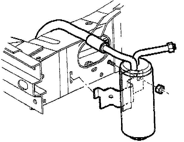 1. Feed receiver-dehydrator hose up over vehicle frame and down to condenser outlet.