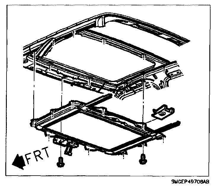 7. Adjust sunroof glass to 1 mm (0.40 in.) below roof surface at front and 1 mm (0.40 in.) above roof surface at rear by loosening sunroof glass attaching screws and moving sunroof glass.
