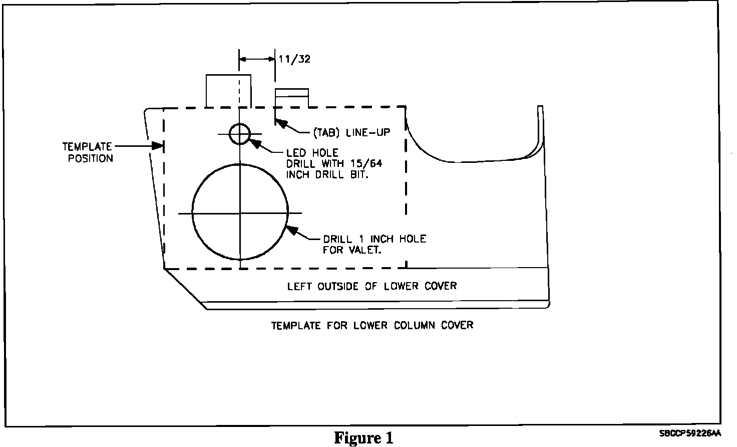 11. Drill a 15/64 inch hole for the LED and a 1 inch hole for the valet switch in the left side of the lower steering column cover. (Refer to Figure 1 for hole locations.)