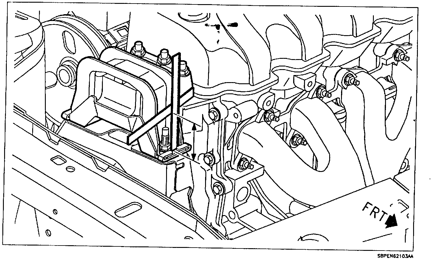 1. Using two 150 mm (6 in.) scales or a 150 mm (6 in.) scale and a suitable straight edge, measure engine mount assembly as shown.