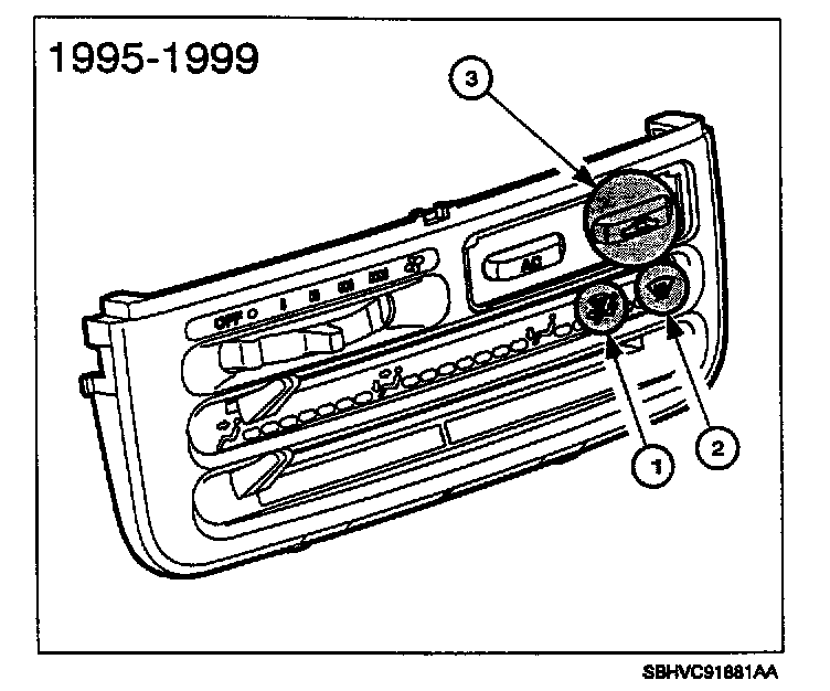 To keep the windows fog free, the climate control system knob should be positioned to Defrost/Heater mode (1) or Defrost mode (2). The Recirculate button should be left off (not depressed) so that indicator light (3) is not On. Use of Recirculate in cold weather is not recommended and can result in window fogging. In cold or humid weather, outside air is best for clearing the windows. To quickly clear the windows, put the fan control switch to high and push the "A/C" button (if equipped). For additional information regarding HVAC operation, refer to "Climate Control System" in the index of the owners handbook.
