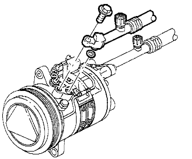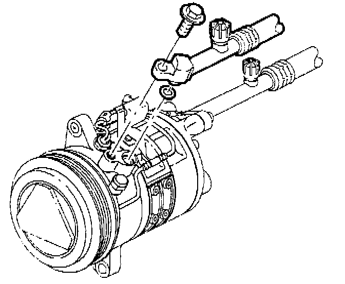 2. Lubricate and install new O-ring on discharge hose with R-12 mineral oil. Install high side hose to compressor high side port. Torque to specification.