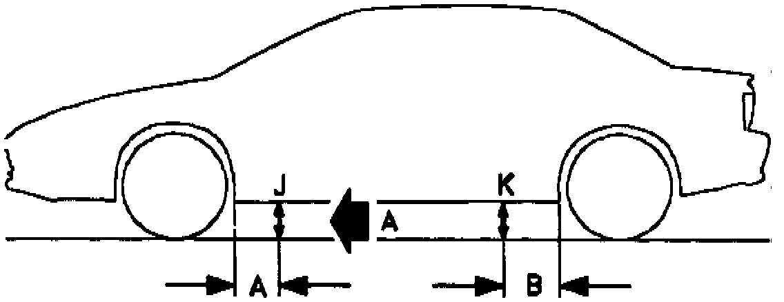 5. Measure from front (A) or rear (B) of rocker flange, to locate vehicle height measuring points J (front rocker height) and K (rear rocker height).