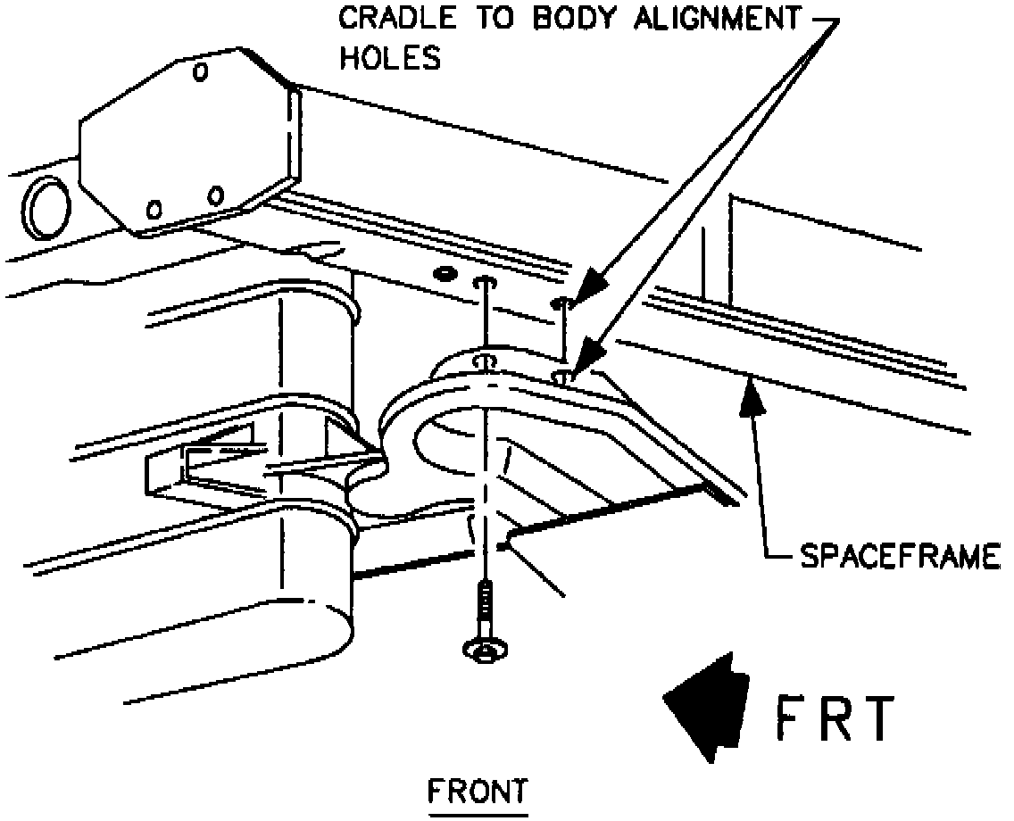 Check cradle to body alignment at two alignment holes using 5/16 inch rod, Fig. 2. If cradle to body alignment is not correct, loosen cradle fasteners and align cradle to body.