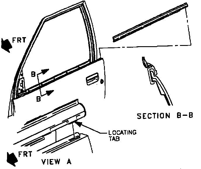 9. Install outer sealing strip by aligning location tab at rear of sealing strip with slot in door panel. Working from the rear forward, push seal strip down on to flange until fully seated.