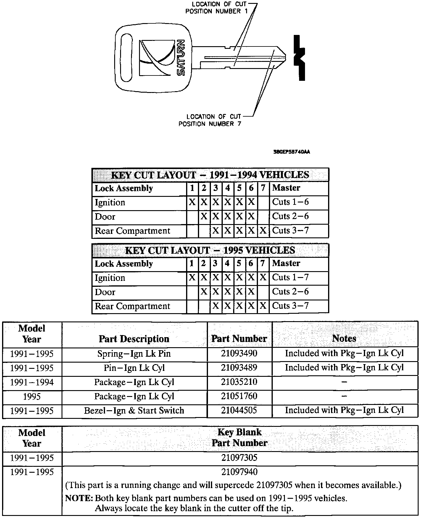 Due to a design change in the 1995 ignition lock cylinder, the Saturn key code book supplied by Ilco-Unican for Saturn Retailers as a part of the key cutting equipment has been revised. In 1991-1994 vehicles, the ignition lock cylinder uses tumbler positions 1 through 6. In 1995 vehicles, the ignition lock cylinder uses tumbler positions 1 through 7.