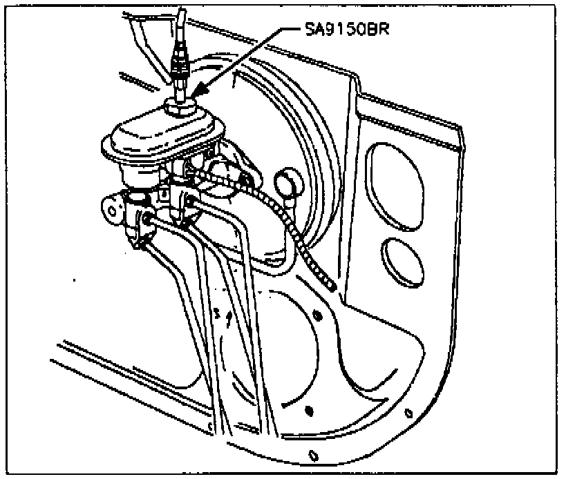 3. Install bleeder adapter tool No. SA9150BR, or equivalent, on brake fluid reservoir, Fig. 9.