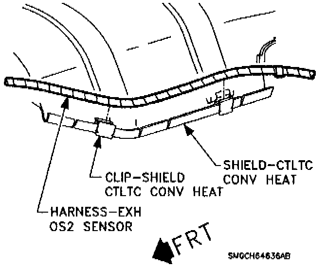 6. Remove the rear heated oxygen sensor wiring harness from the three-way catalytic converter heat shield trough by gently pushing the wiring harness from its retaining clips.