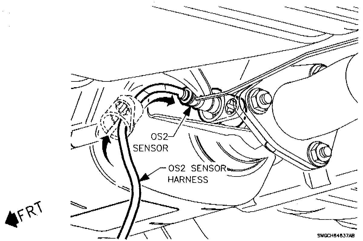 4. Remove rear heated oxygen sensor wiring harness from the cradle by pushing up on retaining clip tab.