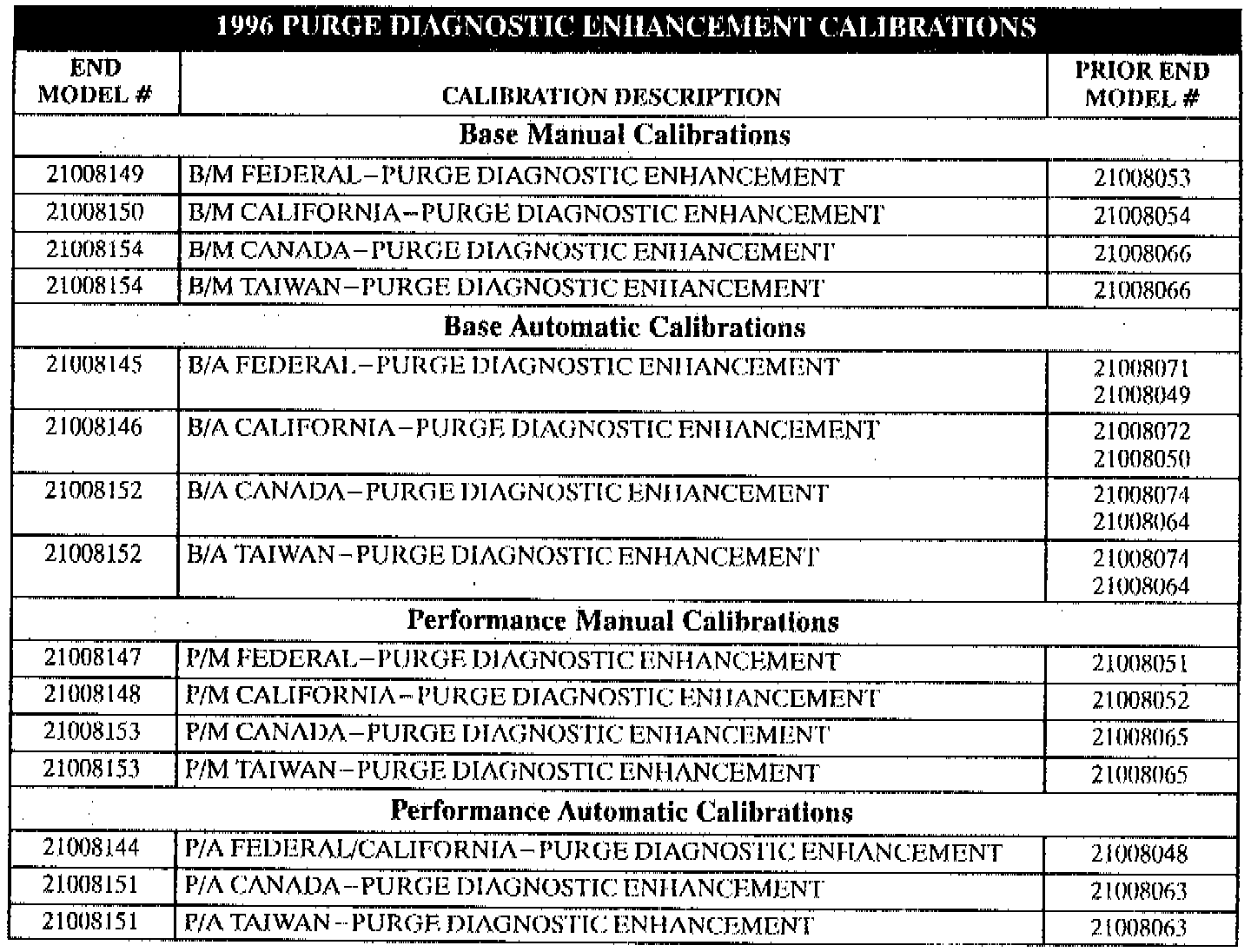 e. Compare END MODEL # to the "1996 Purge Diagnostic Enhancement Calibrations" chart: