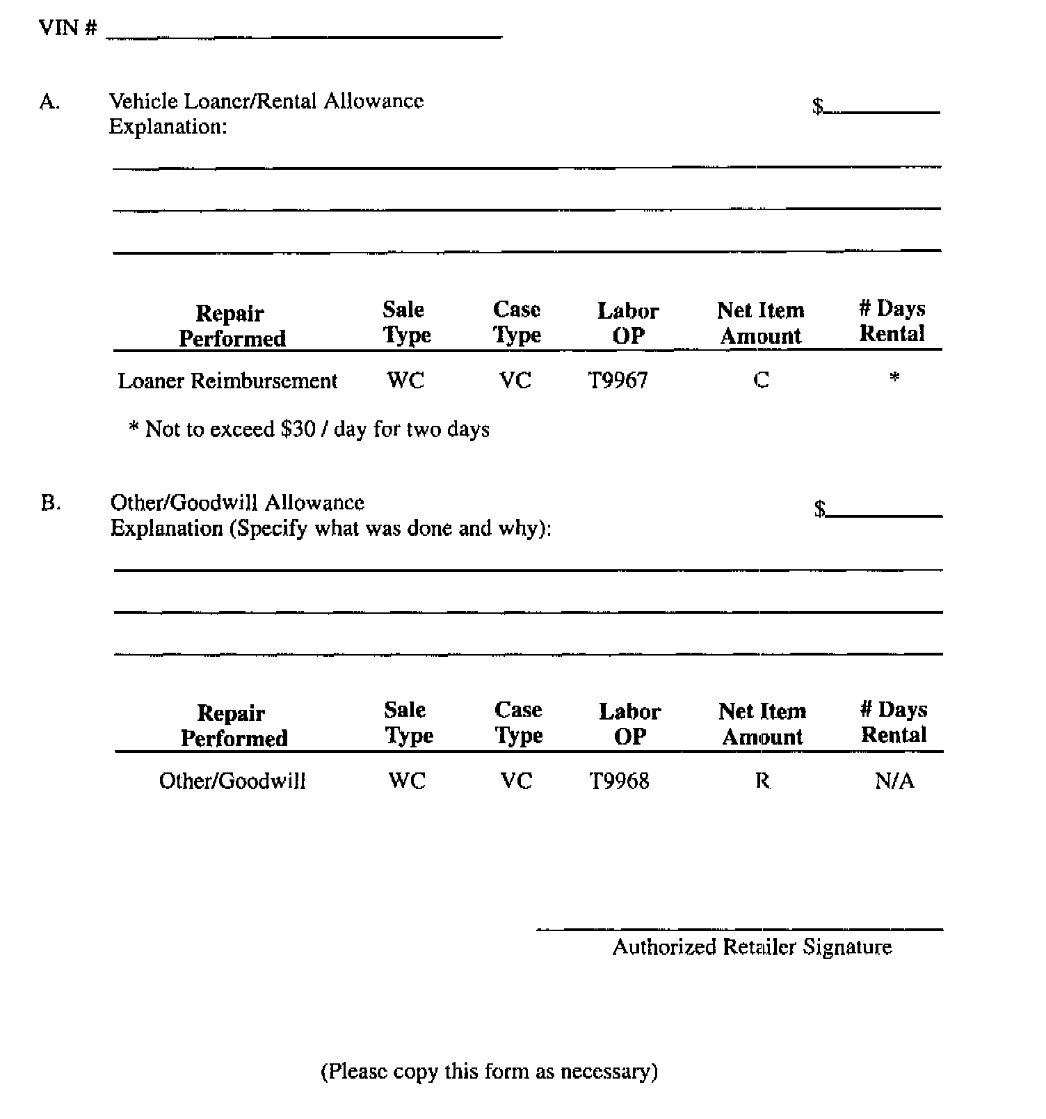 96-C-O1 GOODWILL WORKSHEETAs stated in the "Credit" section of this bulletin, Retailers are empowered to use good judgement regarding loaner/rental cars or other goodwill expenses that might become necessary for customer satisfaction.
