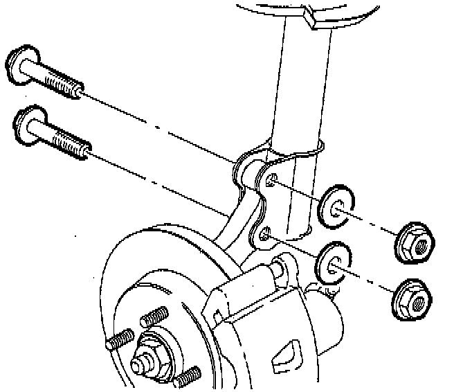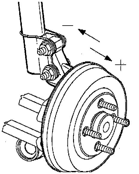 1. Loosen two strut to knuckle fasteners and pull or push on knuckle in the direction of desired camber change. This will allow up to 1.5° of camber adjustment.