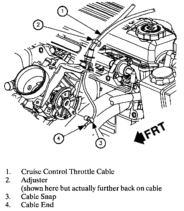 1. Partially disengage adjustment lock on cruise control throttle cable by depressing tabs (do not remove entirely). This will release spring inside adjuster to take out cable slack.