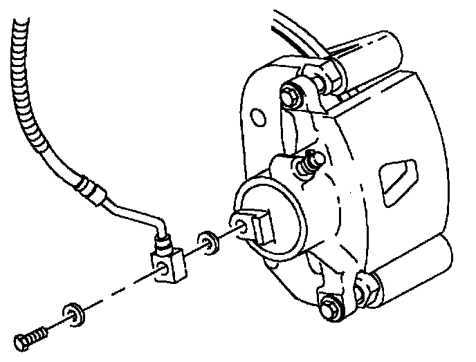 3. Remove brake hose from caliper. Plug openings in caliper and brake hose to avoid fluid loss and contamination.