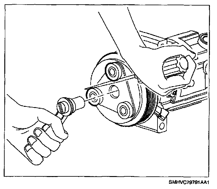 NOTE: Do not remove pulley without puller adapter. If A/C compressor shaft is pressed on, A/C compressor will be damaged.