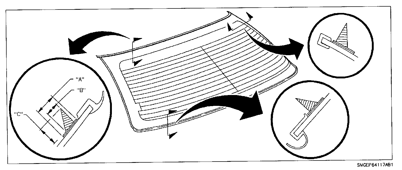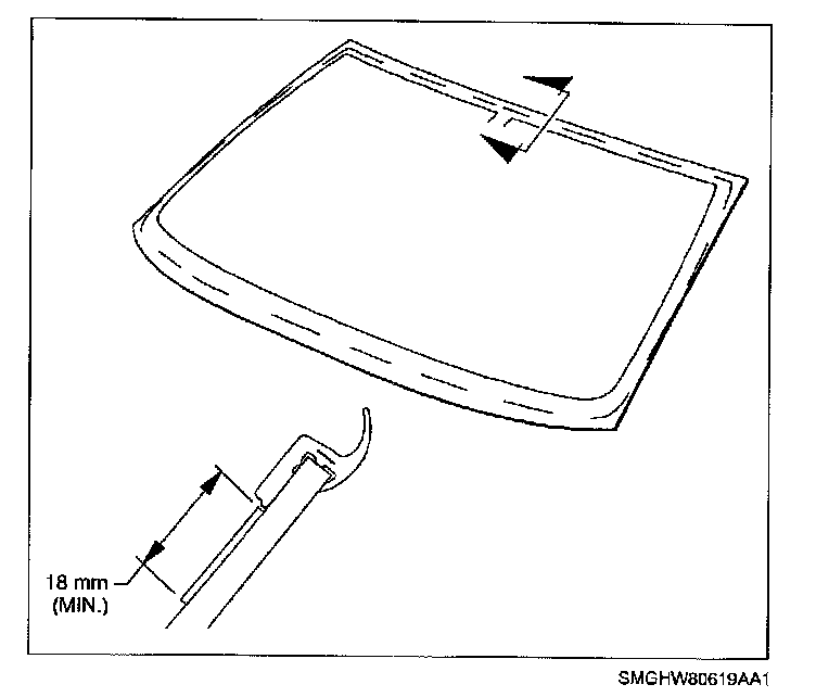 6. Apply a smooth continuous bead of adhesive directly to old urethane adhesive in glass opening or to glass. Apply according to dimensions shown.