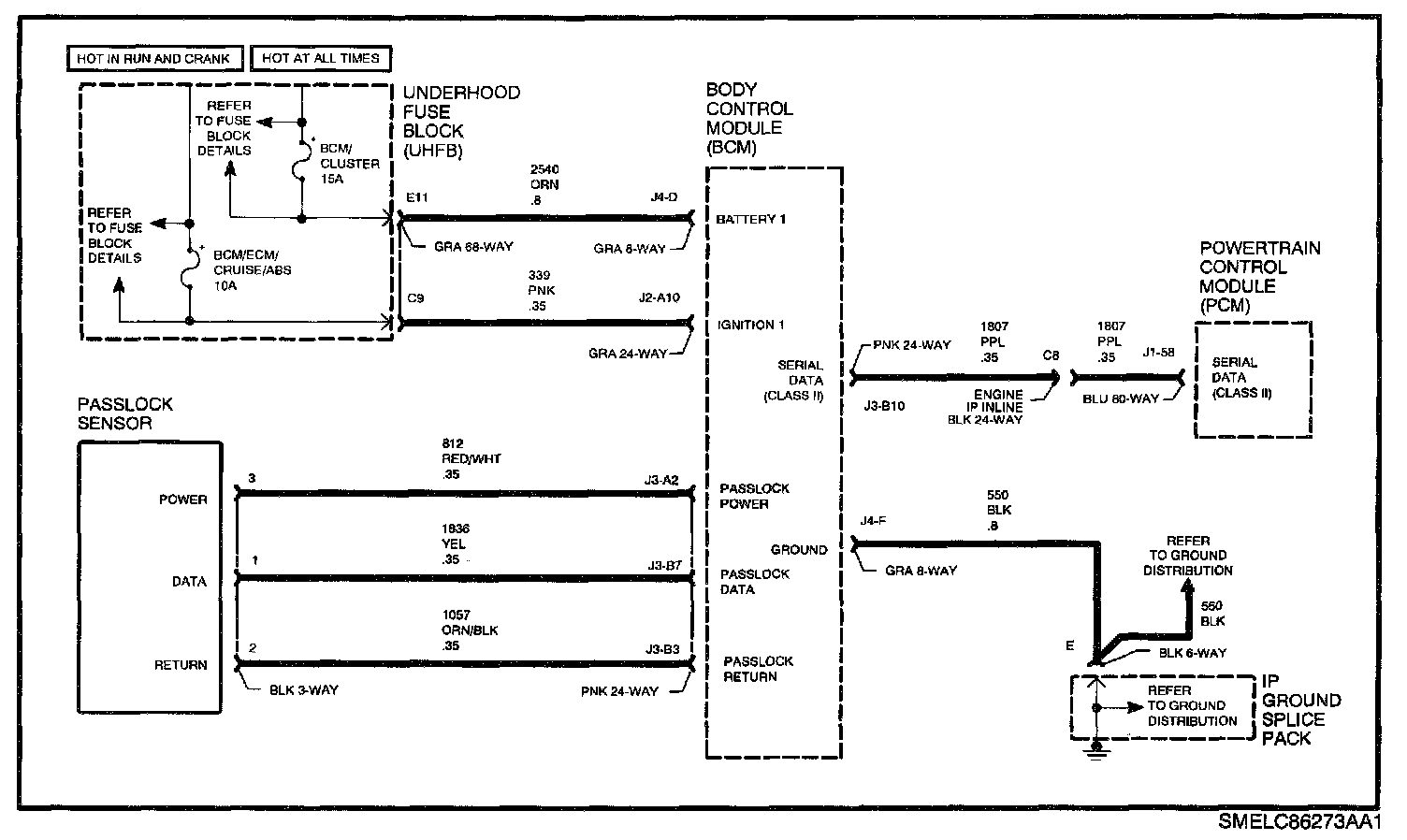 In order to correctly diagnose a no start condition, battery voltage must be above 11 volts and the engine must be cranking at normal cranking speed (above 200 rpm). Fuel level and fuel quality in the fuel tank should be checked (do not solely rely on the fuel gauge for level reading). When the engine is cranked, the BCM will check the password from the passlock sensor. If the password is not received within a certain amount of time or does the match the BCM password, the BCM will send a 'fuel disable password" to the PCM over the Class II link. The SECURITY telltale will flash and the engine will not be allowed to start. If the passwords match, the BCM will send the password over the Class II link to the PCM. If the PCM password does not match the BCM password; or if the PCM does not receive a password from the BCM, it will allow the engine to start then stall within 4 seconds. The SECURITY telltale will flash for 10 minutes if the PCM receives no password, an incorrect password or a disable fuel command. If the password to the PCM is correct, the engine will operate normally. The password is sent continuously by the BCM to the PCM during run mode. If the password becomes lost or incorrect during the drive cycle, the vehicle will be allowed to start on succeeding ignition cycles without the aid of passlock and the SECURITY telltale will be On steady. This mode is called fail enable mode.